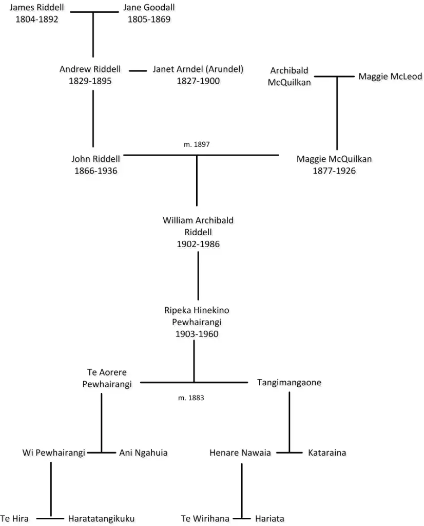 This presentation merely covers those who descend from William Archibald (Bill or Billy) Riddell and his first wife, Ripeka Hinekino Riddell (nee Pewhairangi) and those of his second wife, Tahua Gomez (nee Honetana).